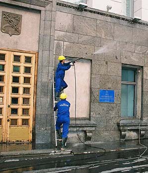 При выезде на место специалист проводит осмотр объекта, выполняется ограждение территории, разведение составов для очистки фасада, проверка снаряжения для промышленных альпинистов.